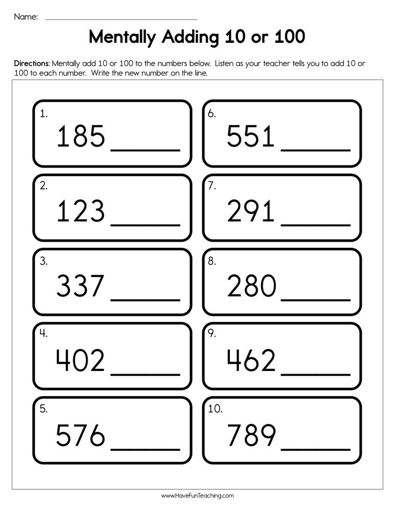 Similarly, keep adding 10 to the previous number till you have 50 cans. This handy tool helps kids in kindergarten and grade 1 to think flexibly and to manipulate numbers in different ways. For example, adding groups of apple jacks (a breakfast cereal) by counting will quickly lead students to understand . Do 54+3 by making tens by turning 54 into 50 then adding 50 + (4+3). Adding 1s, 10s, and 100s. This adding 10 race is perfect for your lesson! © maths circle ltd 2020. Math salamanders math addition worksheets picture. This way you count faster. Use to get your children actively using their. Here are a few strategies that will help you teach your child . Lily pad counting in 10s from any given number worksheet. No, i had 3 tens before, and i'm not adding tens this time so i'm still going to have .